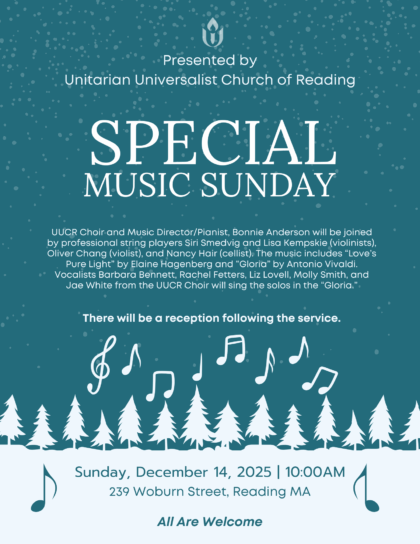 Please join us this Sunday, December 14, 2025 at 10:00am for a Special Music Service led by our talented music director, Dr. Bonnie Anderson, and our talented UUCR choir. Joining them will be professional string players Siri Smedvig and Lisa Kempskie (violinists), Oliver Chang (violist), and Nancy Hair (cellist).